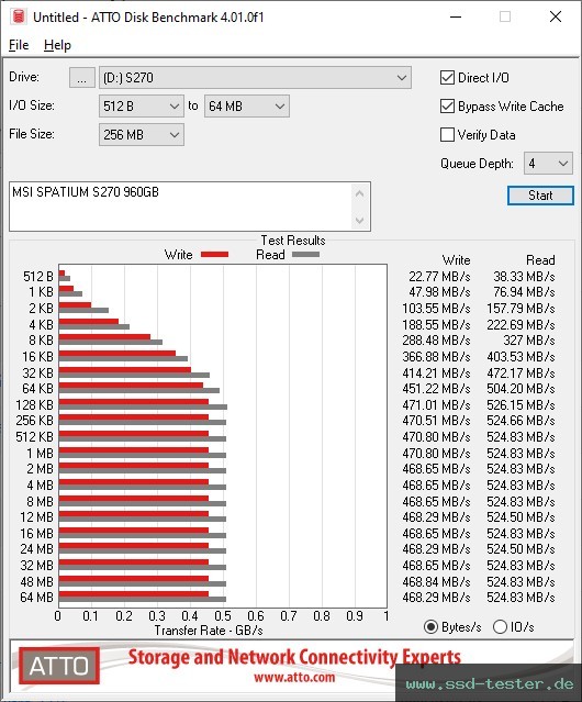 Hier wird mehrmals eine 256 MB große Datei auf die MSI SATA SSD geschrieben. Die I/O Blockgröße ist dabei unterschiedlich (von 512 Byte bis 64 Megabyte). Je größer die Blöcke, umso schneller kann meist geschrieben und gelesen werden.