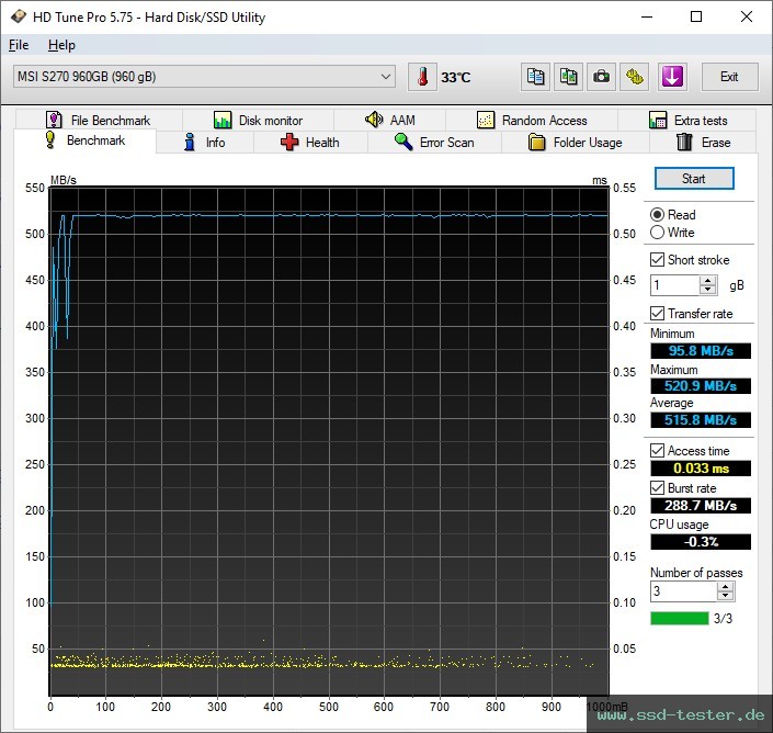 HD Tune schreibt eine 1 GB große Datei auf die MSI SATA SSD. Die Übertragungsdaten der Lese-Geschwindigkeit werden dabei grafisch angezeigt. Ebenfalls wird der Minimum-, Maximum- und Durchschnittswert ermittelt. Angezeigt wird auch die ermittelte Access time und die Burst rate.