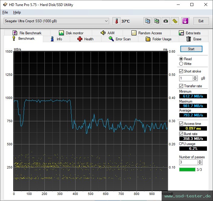 Hier wird die Schreib- sowie Lesegeschwindigkeit (laut Hersteller 1000 MB/s und 1000 MB/s) des Seagate USB-Sticks in Abhängigkeit von der Komprimierbarkeit der Daten gemessen.